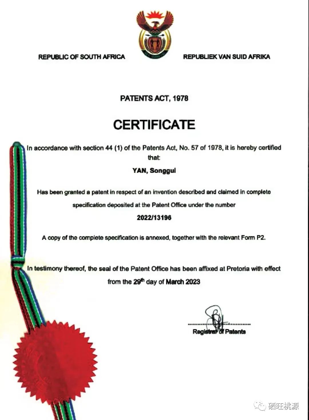 7月14日,從北京傳來(lái)喜訊,桃源縣富硒產(chǎn)品研究所申報(bào)的“一種多礦物質(zhì)飼料添加劑和制備方法及應(yīng)用”發(fā)明專(zhuān)利,被南非公司與知識(shí)產(chǎn)權(quán)注冊(cè)局下發(fā)發(fā)明專(zhuān)利證書(shū),于2023年3月29日授權(quán),截止期限:2042年12月6日。專(zhuān)利號(hào):2022/13196。